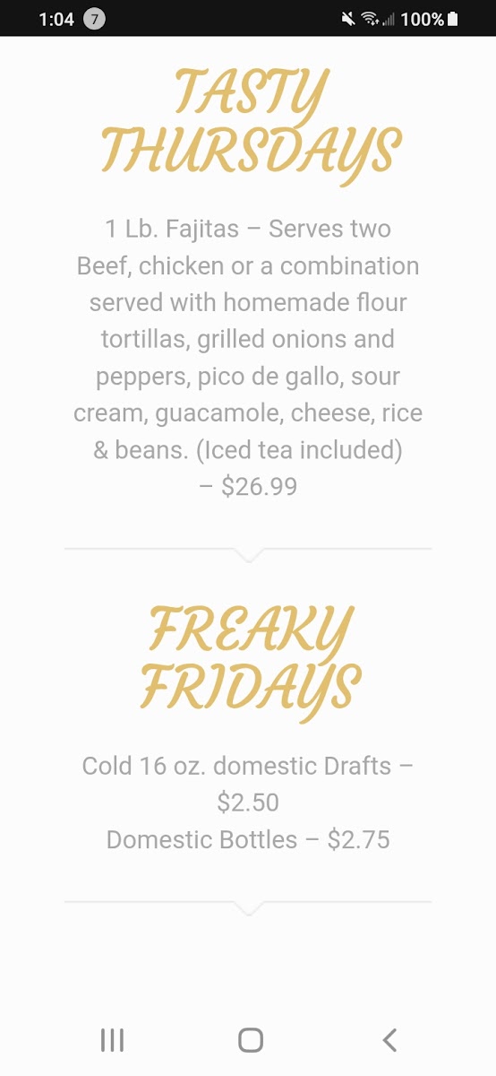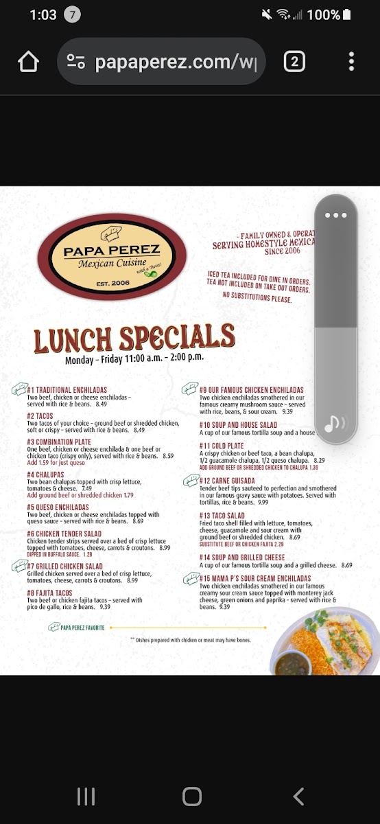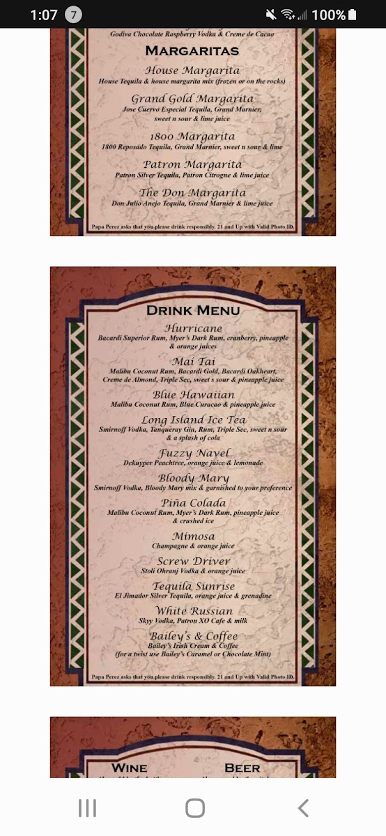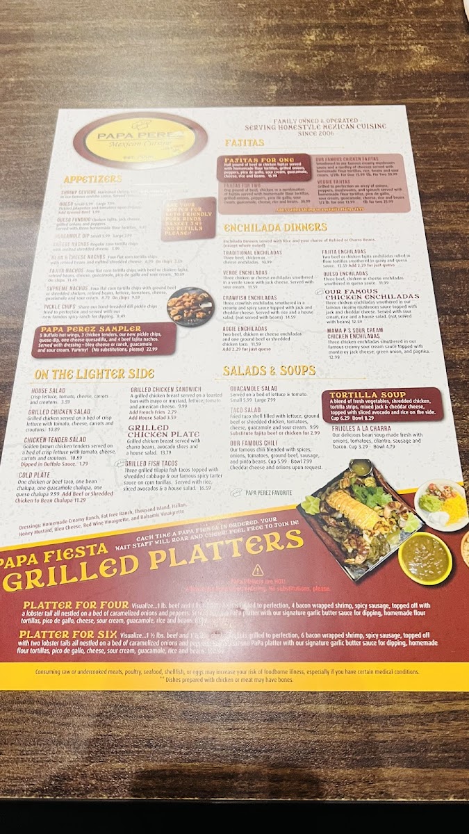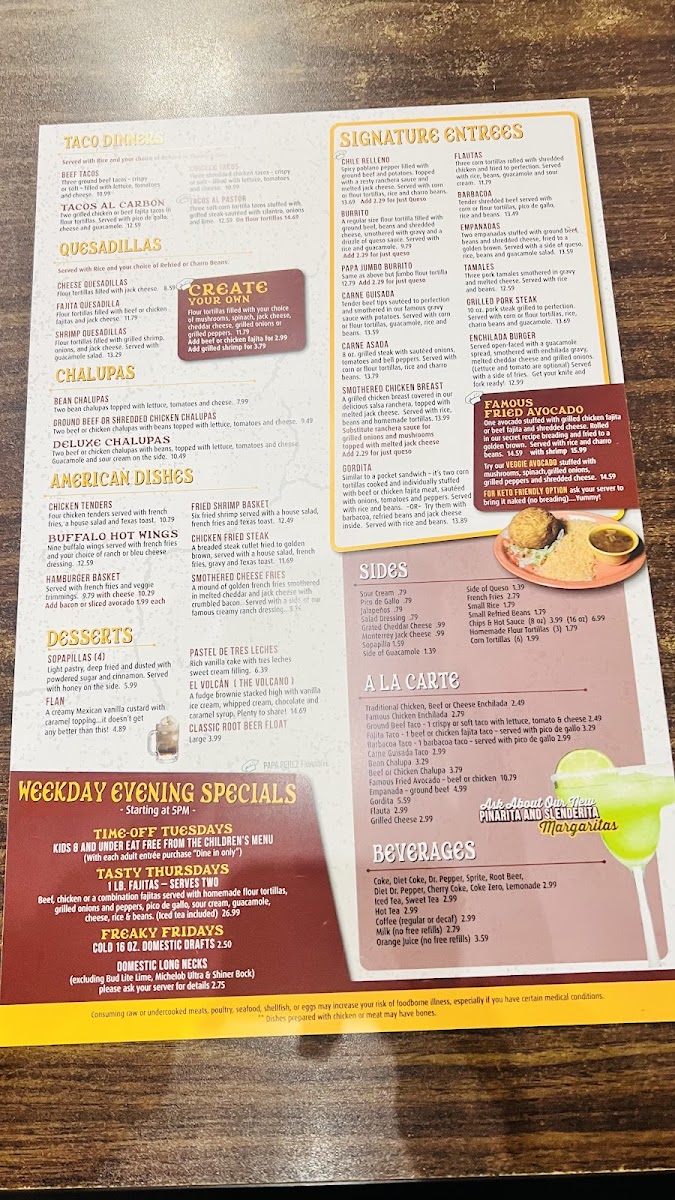 At Papa Perez Mexican Cuisine, located at 200 S Main St, Bryan, TX 77803, we invite you to embark on a flavorful journey through the heart of Mexico! Our menu is a vibrant celebration of traditional recipes and bold flavors that are sure to tantalize your taste buds. Be sure to kick-start your meal with our famous Bloody Mary or indulge in our creamy Guacamole paired with a Small Queso for the perfect appetizer. Dive into our mouthwatering Verde Cheese Enchiladas, or try the refreshing Shrimp Ceviche for a taste of the coast. For a heartier option, our Barbacoa Breakfast and Chicken Fajitas are must-tries! Don’t miss out on our delightful desserts, especially the Tres Leches Cake, which promises to end your meal on a sweet note. Whether you're enjoying a casual weeknight dinner or celebrating a special occasion, our Combination Plate and unique dishes like Chicken Stuffed Avocado and Fried Avocado with Fajita Beef will surely impress. Come savor the flavors of Papa Perez—your taste buds will thank you!